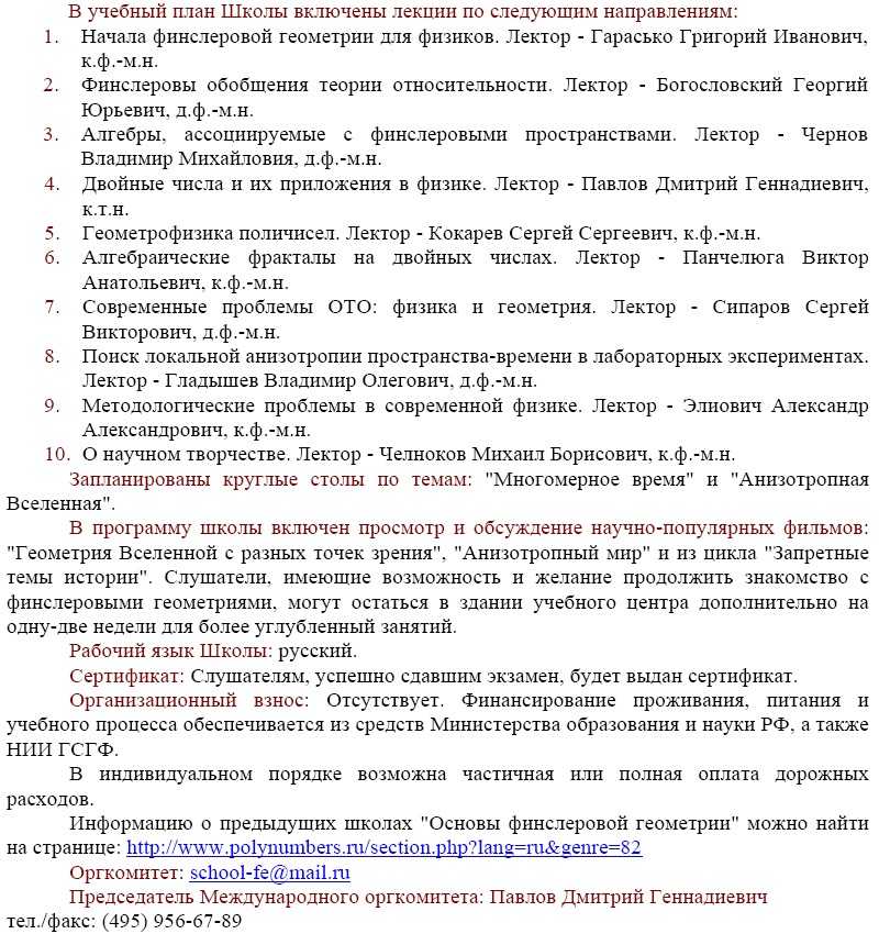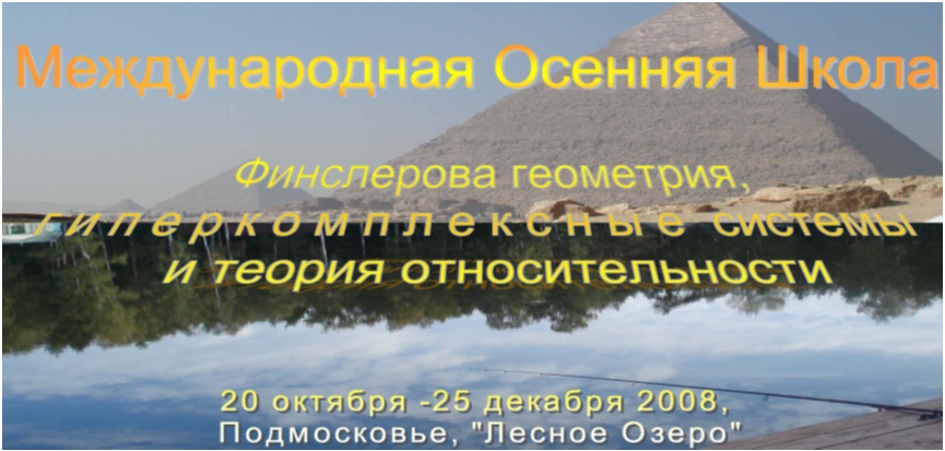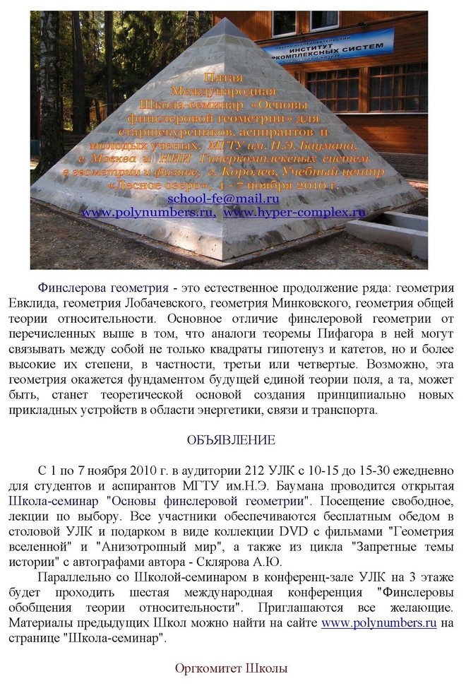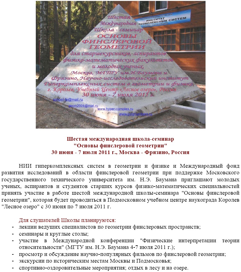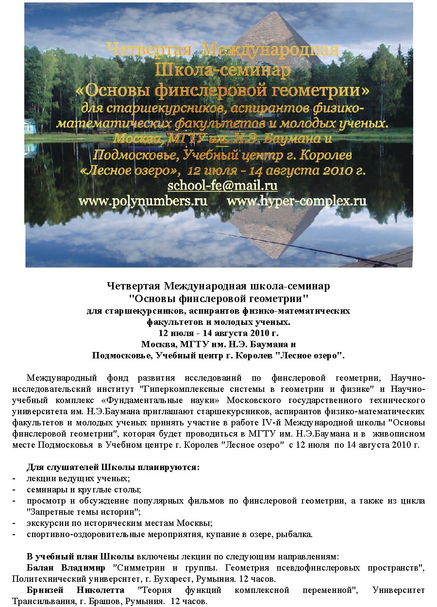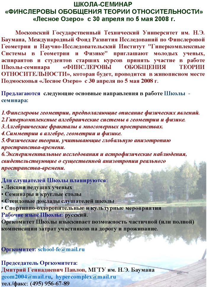 Международный фонд развития исследований по финслеровой геометрии и Научно-исследовательский институт "Гиперкомплексных систем в геометрии и физике" приглашают старшекурсников, аспирантов физико-математических факультетов и молодых ученых принять участие в работе Третьей Международной школы «Основы Финслеровой Геометрии», которая будет проводиться при содействии Московского Государственного Технического Университета им. Н.Э. Баумана в живописном месте Подмосковья «Лесное Озеро» с 20 июля по 15 августа 2009 г.