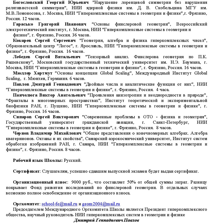 • Гарасько Григорий Иванович «Основы финслеровой геометрии», Всероссийский электротехнический институт, НИИ "Гиперкомплексных систем в геометрии и физике" , Россия.